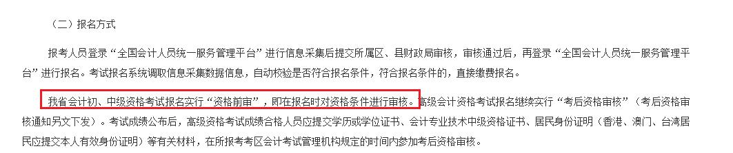 根据福建省财政厅发布的《福建省会计专业技术资格考试领导小组办公室关于2026年度全国会计专业技术资格考试福建考区考务日程安排及有关事项的通知》可知:中级资格考试报名实行“资格前审”,即在报名时对资格条件进行审核。