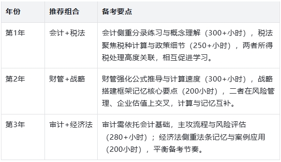 适配备考时间:难科(会计、财管、审计)每科需300+小时备考,中/易科(税法、经济法、战略)需200-250小时,按每日可投入时长合理定科目数量。