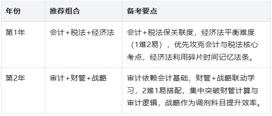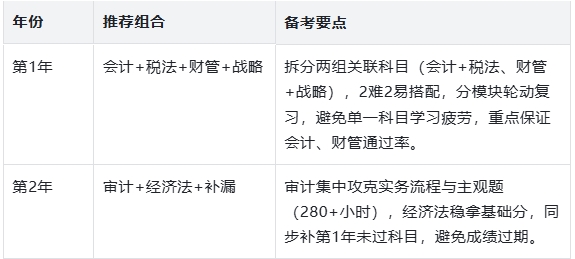 难易平衡搭配:难度梯度排序(从高到低):会计≈财管>审计>税法>经济法≈战略。同一年建议1难+1-2易/中科目,避免扎堆报考高难度科目(如会计+审计+财管),防止精力分散。