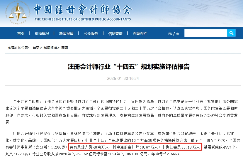 根据中国注册会计师协会发布的《注册会计师行业“十四五”规划实施评估报告》,截至“十四五”期末,注册会计师共有从业人员40余万人,注会全科合格人数达到434600余人,为行业人才建设持续注入新的力量,也为各行各业输送了优质人才。