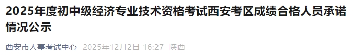 根据《国务院办公厅关于全面推行证明事项和涉企经营许可事项告知承诺制的指导意见》(国办发〔2020〕42号)、《人力资源社会保障部办公厅关于印发《部本级全面推行证明事项告知承诺制实施方案》的通知》(人社厅发〔2020〕110号)的规定和要求,按照《人力资源社会保障部办公厅关于2025年度专业技术人员职业资格考试计划及有关事项的通知》(人社厅发〔2025〕1号)、人力资源和社会保障部人事考试中心《关于做好2025年度初级、中级经济专业技术资格考试考务工作的通知》(人考中心函〔2025〕28号)的安排,2025年度初中级经济专业技术资格考试成绩已在中国人事考试网(http://www.cpta.com.cn)公布,请及时登陆查询。现将2025年度初中级经济专业技术资格考试西安考区成绩合格拟取得资格证书人员承诺情况予以公示,共2107人(名单附后)。