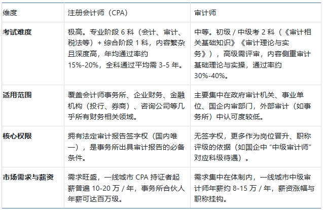 属于执业资格证书,由中国注册会计师协会组织考试,是国内唯一拥有审计报告签字权的证书,受《注册会计师法》保护,主要服务于会计师事务所的审计、鉴证业务,同时在企业财务总监、投行分析师等岗位中认可度极高。