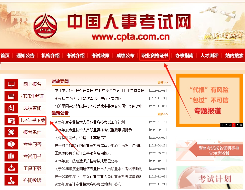 访问中国人事考试网(www.cpta.com.cn),点击首页左侧"电子证书下载"栏目,进入全国专业技术人员职业资格证书查询验证系统。已在中国人事考试网"全国专业技术人员资格考试报名服务平台"注册过的持证人员,可直接使用该平台的用户名、密码进行登录;未注册过的持证人员需先点击"用户注册"按钮进行注册。