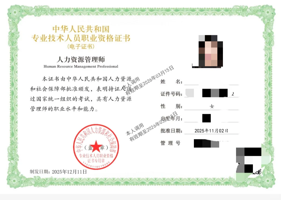 证书内页信息:包含个人基本信息(姓名、身份证号、性别、出生年月)、取得资格信息(专业类别、级别、取得资格时间)、管理号和二维码信息等,并加盖中华人民共和国人力资源和社会保障部印章及照片钢印。