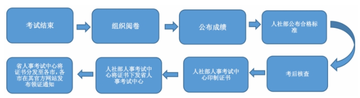 人社部人事考试中心印制完成证书后,将证书下发各省,省人事考试中心立即分发至全省各设区市,各市收到证书后在其官方网站发布领取证书通知,考生即可领取证书。