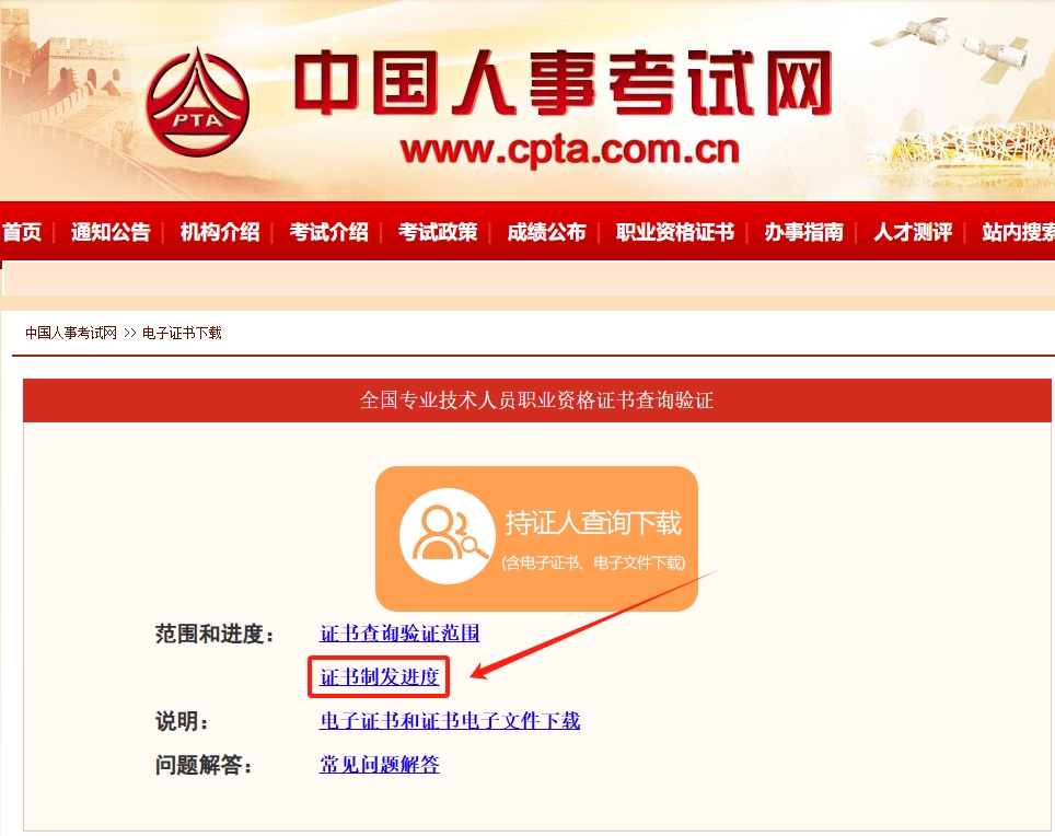 在此期间,考生可以关注中国人事考试网“资格证书”栏目,点击“电子证书下载”-“证书办理进度”查看证书的制作进度。