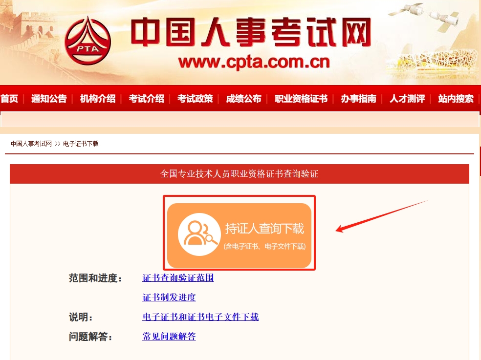 访问中国人事考试网官网(www.cpta.com.cn),点击首页左侧的"电子证书下载"栏目。已在中国人事考试网注册过的考生,可直接使用用户名和密码登录;未注册的考生需先完成实名注册,使用取得证书时所用证件的证件号码进行注册。