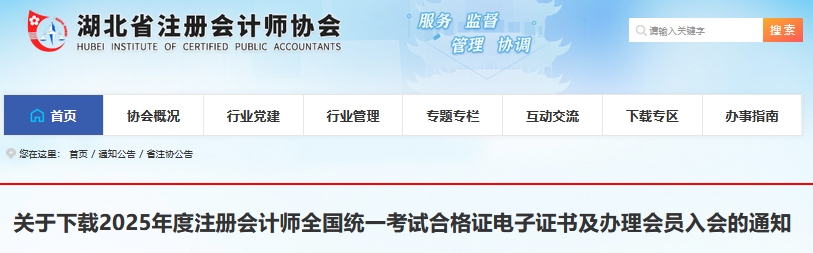 2026年1月19日,湖北省注册会计师协会发布了《关于下载2025年度注册会计师全国统一考试合格证电子证书及办理会员入会的通知》,考生可以自行查询、下载专业阶段合格证、全科合格证(电子证书)。