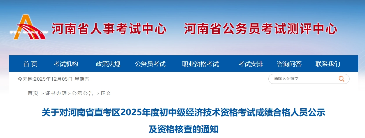 12月4日,河南省人事考试中心发布了《关于对河南省直考区2025年度初中级经济技术资格考试成绩合格人员公示及资格核查的通知》,从中得知,2025年河南中级经济师考后核查时间、方式及所需材料均已公布,请查阅。