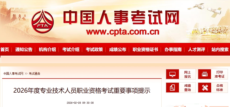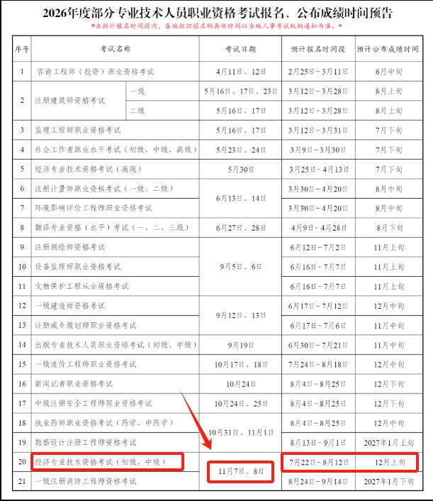● 2026年度部分专业技术人员职业资格考试报名、公布成绩时间预告