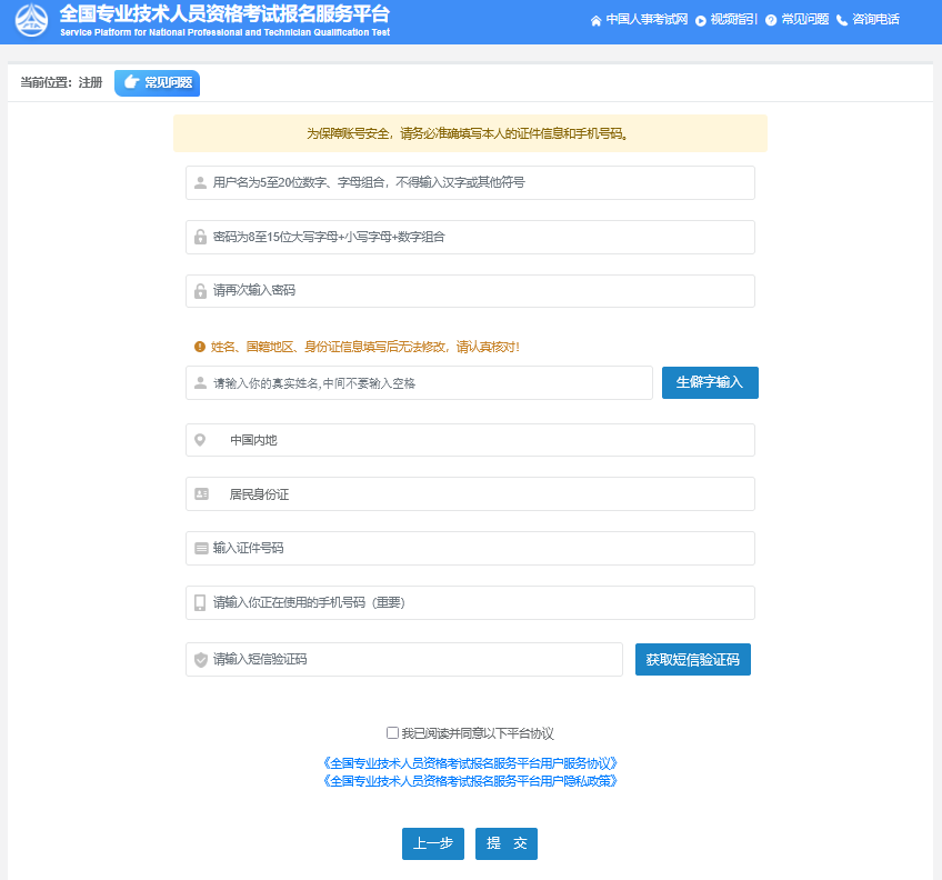 ③填写完毕确认无误后点击【提交】,出现信息确认,需要考生重新输入姓名、证件类型、证件号码进行二次确认。