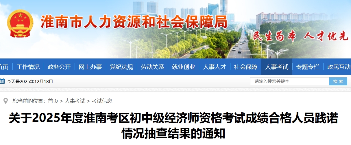 为切实加强事中事后监管,确保告知承诺制试点工作顺利推进,根据省人力资源和社会保障厅《关于专业技术人员资格考试告知承诺制试点工作有关事宜的通知》(皖人社秘〔2020〕41号)以及资格考试报名证明事项告知承诺制有关要求,我市对2025年度淮南考区初中级经济师资格考试,成绩合格人员报考资格条件进行随机抽查,抽查人员名单见附件。