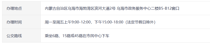内蒙古自治区乌海市海勃湾区滨河大道2号,乌海市政务服务中心二楼B5-B12窗口