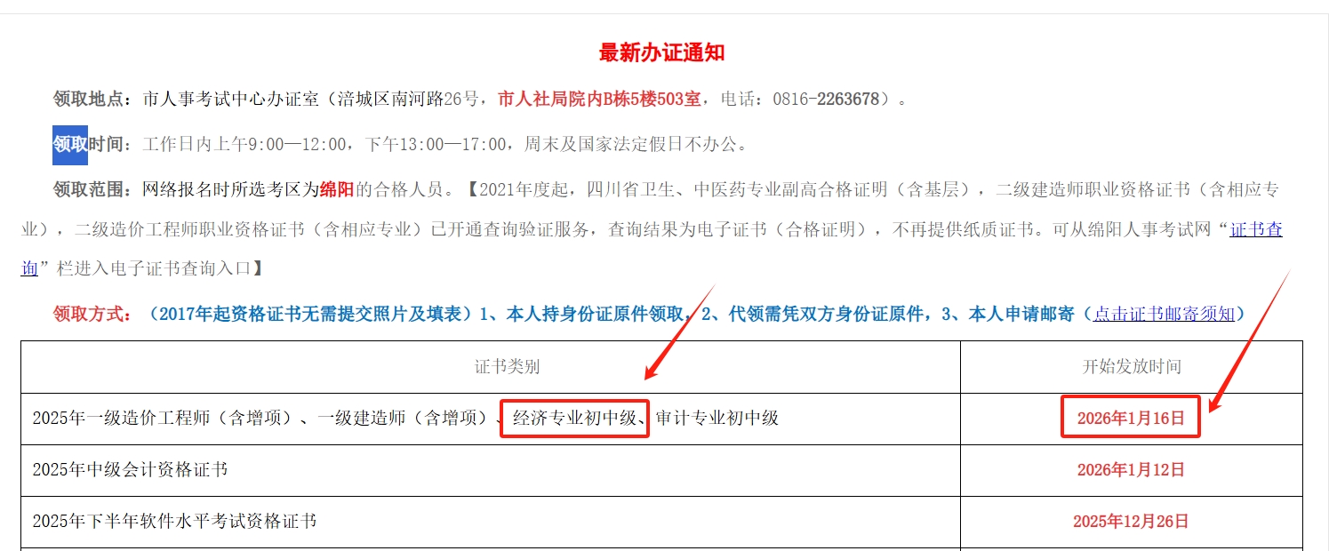 2025年绵阳中级经济师证书领取时间为2026年1月16日起,工作日(周一至周五)上午9:00——12:00、下午13:00——17:00均可办理,周末及法定节假日不办公。这一时间安排与往年证书发放周期基本一致,通常在考后成绩公布后2-3个月开始发放,具体时间由当地人事考试中心根据制证进度确定。