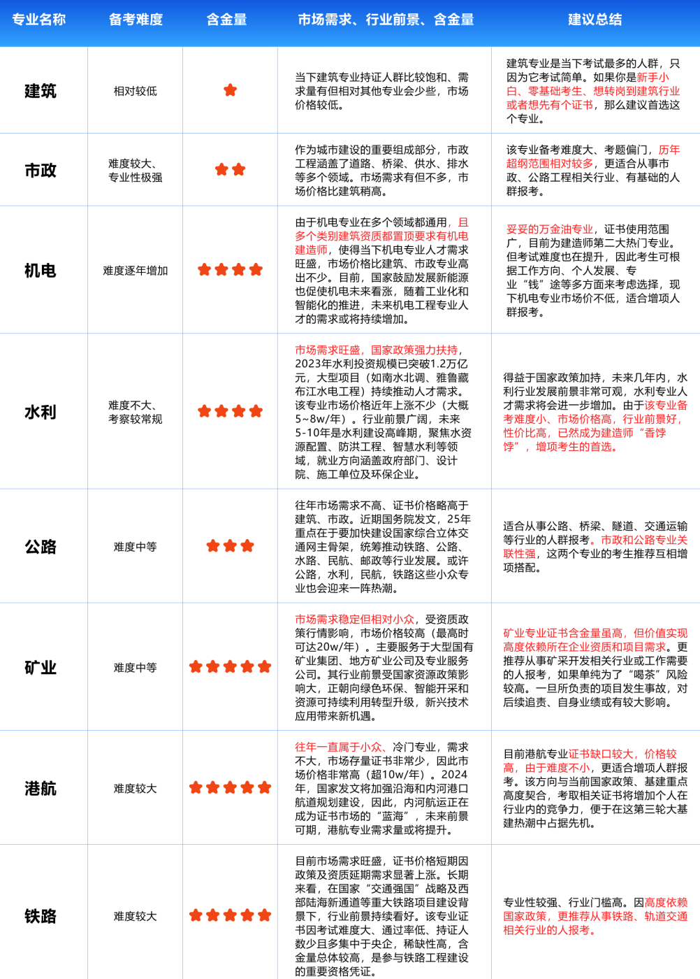 选择建议:如果你是零基础小白,建议从建筑开始,先拿证再增项。如果你有相关专业背景或工作经验,挑战高难度高回报的专业是更优选择。