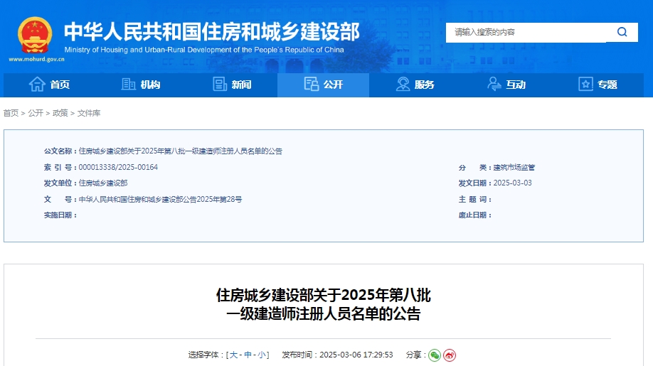 2025年第八批一级建造师注册人员名单公告已发布,本批次共32239人符合一级建造师注册条件,其中,初始注册共4192人,延续注册8037人,增项注册839人,重新注册19171人。