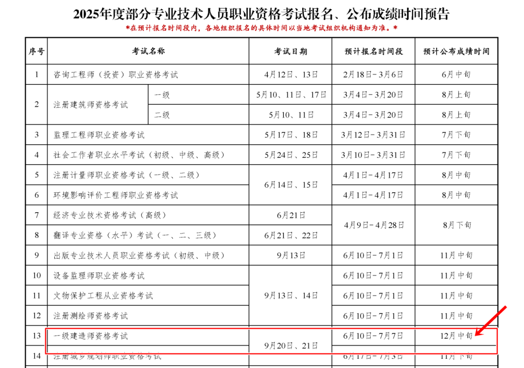 根据中国人事考试网发布的《2025年度专业技术人员职业资格考试重要提示》及多方权威信息,2025年一级建造师考试成绩预计于12月中旬正式公布,这一时间节点与往年规律高度吻合,考生可提前做好查分准备。