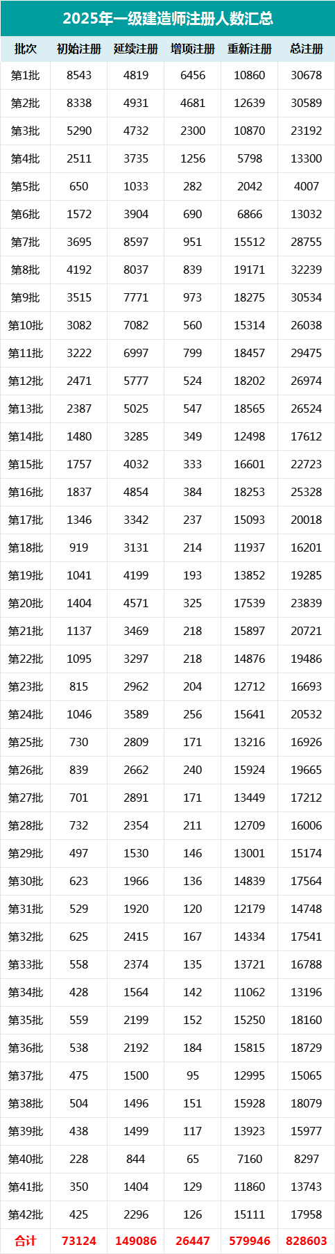 截止目前,住建部已公布1-42批次注册名单,总注册人数为828603,具体如下: