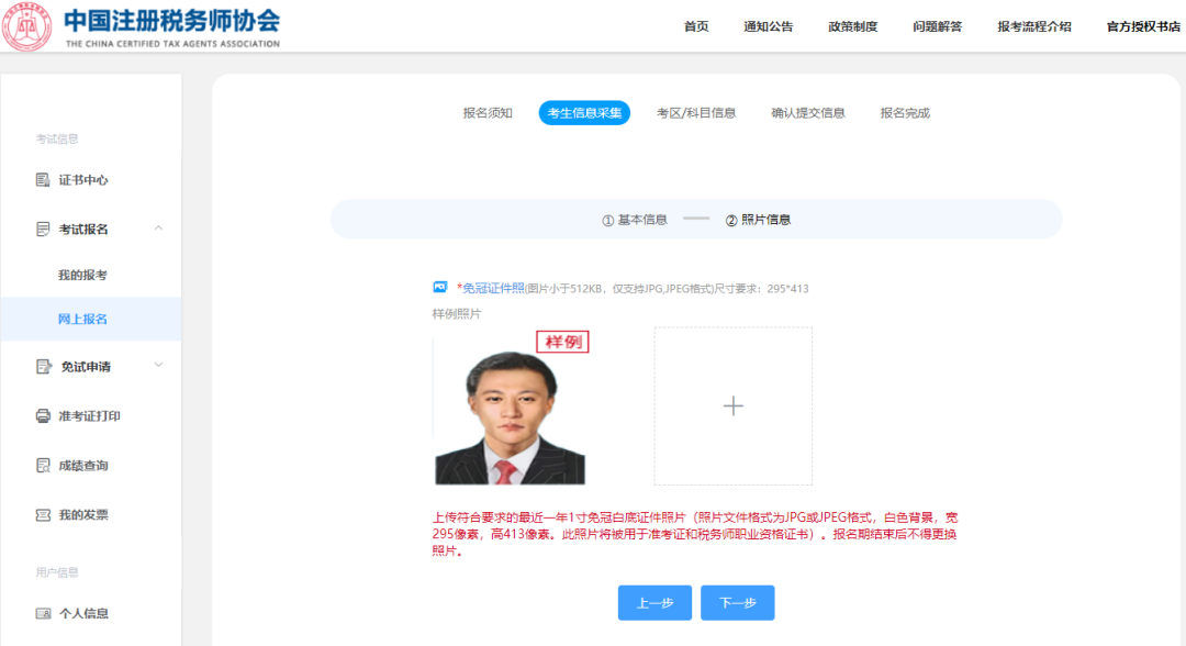 照片要求:JPG或JPEG格式,白色背景,宽295像素,高413像素,此照片将被用于准考证和税务师职业资格证书。