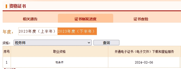 2023年度税务师职业资格电子证书已经上线。已通过审核的全科合格人员可登录中国人事考试网(www.cpta.com.cn)“证书查验”栏目,查询并下载本人电子证书。