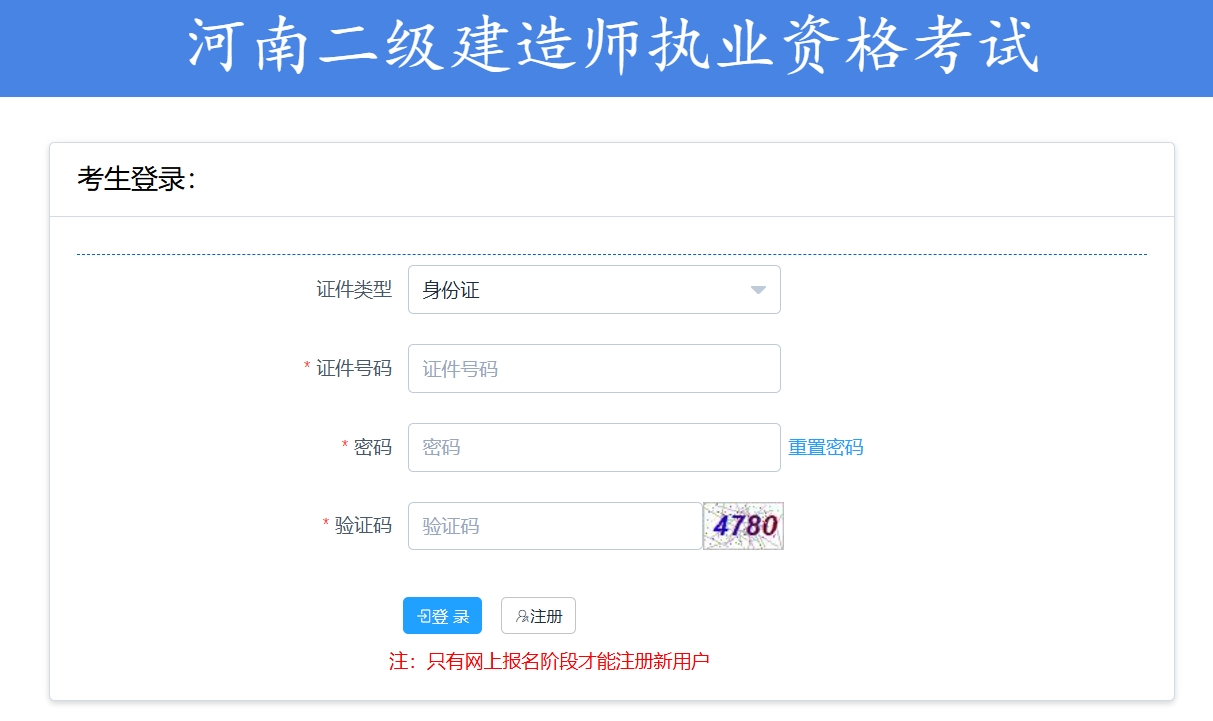 2025年河南二建报名入口官网为河南省人事考试网(http://www.hnrsks.com),报名平台为河南二级建造师执业资格考试报名系统,登录页面截图如下: