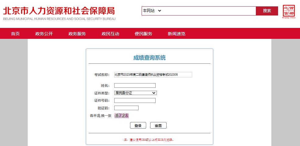 2023年北京二级建造师成绩查询入口:北京市人力资源和社会保障局(http://fuwu.rsj.beijing.gov.cn/kwscore/login/zg.htm?examId=4740)