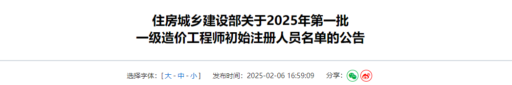 2025年第一批一级造价师初始注册人员名单公告原文如下: