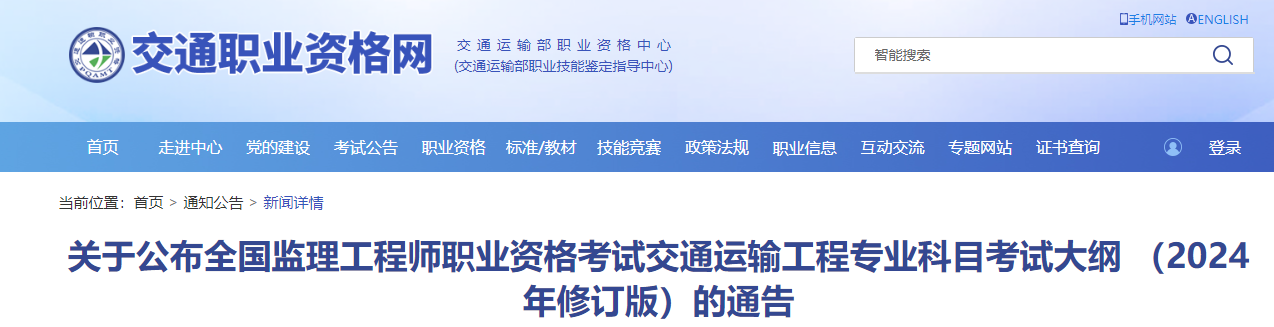 1月17日,交通职业资格网发布了“关于公布全国监理工程师职业资格考试交通运输工程专业科目考试大纲 (2024年修订版)的通告”,小编整理了通告详情,供大家参考。