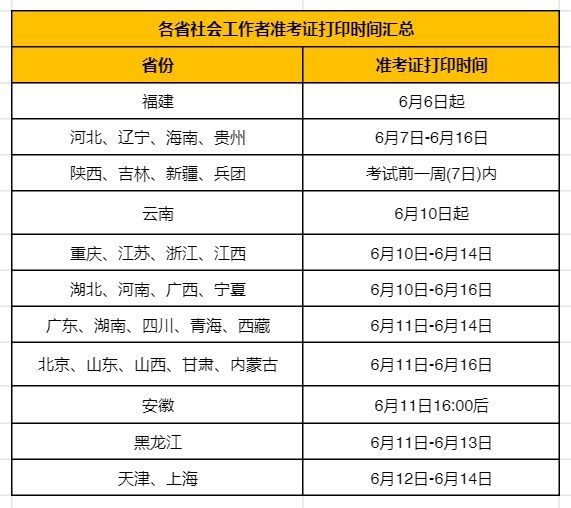 各省报名通知中2024年社会工作者准考证打印时间表如下: