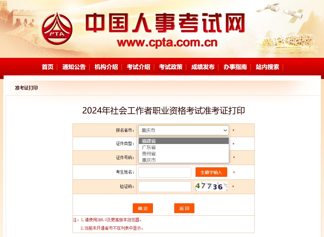 根据相关通知,2024年社工考试准考证打印入口于6月6日陆续开始打印,各省具体打印时间不同。2024年5月29日,小编进入中国人事考试网准考证打印栏目,发现重庆、福建、贵州、广东四地准考证打印或已开始,相关地区考生可尝试打印准考证,看能否成功。
