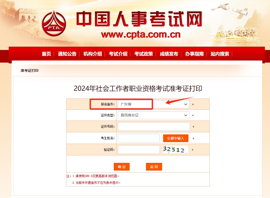 3.进入准考证打印页面,在下拉菜单选择报名省市-广东省,选择证件类型,依次填入“证件号码”、“考生姓名”和“验证码”,点击确定,下载打印准考证。