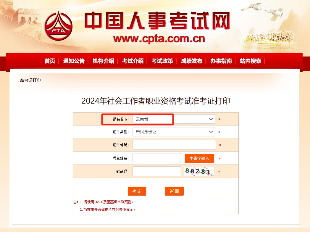 2.在列表里选择要打印准考证的考试:社会工作者考试,确定好开考年月:202406,考试代码:038。
