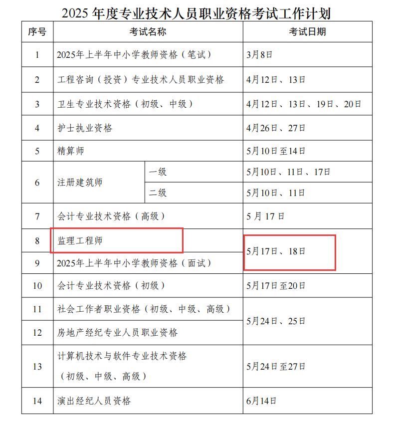2025年安徽监理工程师考试时间公布,定于5月17日-5月18日。