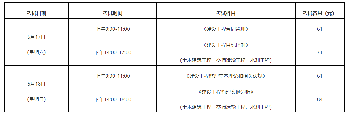 2025福建省监理工程师考试共设四门科目,分别是《建设工程合同管理》、《建设工程目标控制》、《建设工程监理基本理论与相关法规》和《建设工程监理案例分析》。考试时间为5月17日-5月18日,具体考试安排如下: