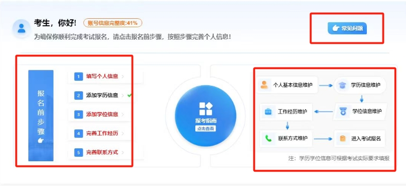 2、完善个人信息:成功注册后,进入个人信息完善页面,包含填写个人信息、添加学历信息、添加学位信息、完善工作经历、完善联系方式这5个步骤。务必确保所填信息真实准确,待“账号信息完整度”达到100%时,才可以进入正式报名环节。注意,个人信息完善的必填项必须全部完成,选填项虽可暂不填写,但在后续填写报名表时可能也会要求补充,所以提前准备好相关资料进行信息维护,能避免影响报名进度。