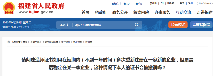 问:请问建造师证书如果在短期内(不到一年时间)多次重新注册在一家新的企业,但是最后稳定在某一家企业,这种情况下本人的证书会被撤销吗?