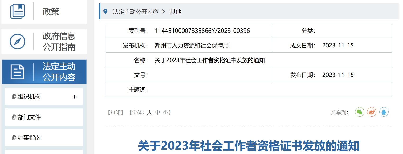 潮州市人力资源和社会保障局近日发布《关于2023年社会工作者资格证书发放的通知》,2023年潮州社会工作者资格证书现场签领11月16日起,证书邮寄11月16日至11月25日办理在线申办。