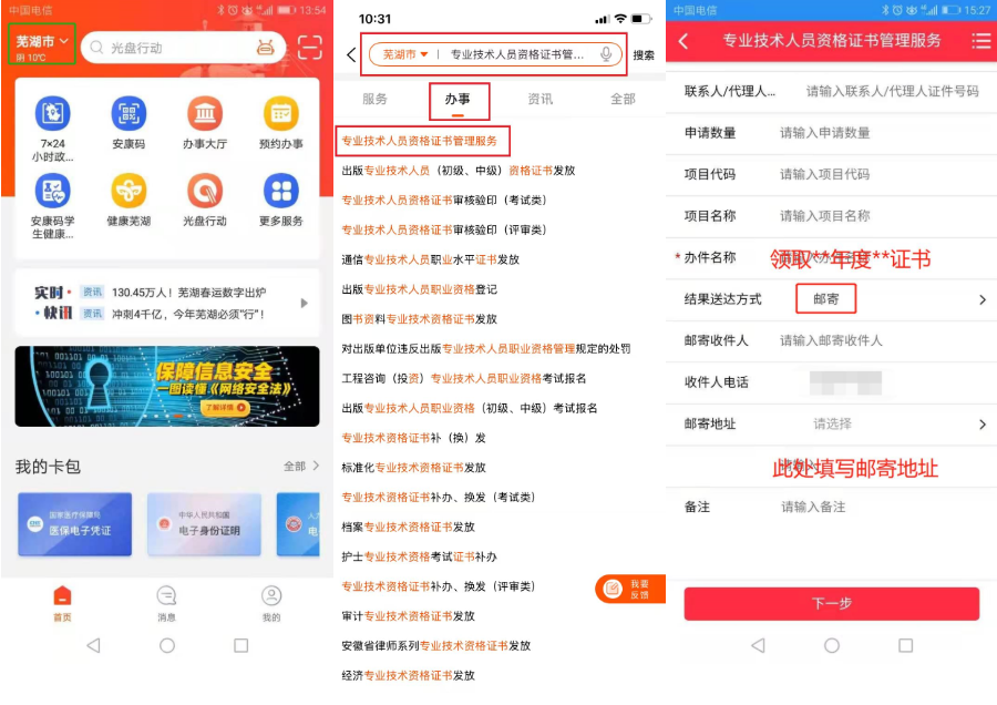 方式1:移动端申请(推荐使用),手机下载皖事通APP,城市选择芜湖,搜索栏搜索“专业技术人员资格证书管理服务”,在线办理。