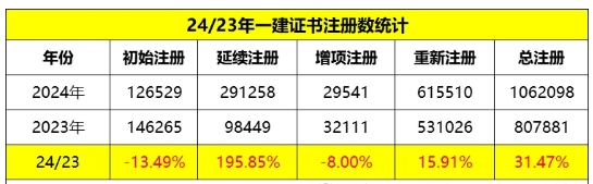 相比于去年同样批次的注册数量,今年的总注册增加了31.47%,其中初始注册减少了13.49%,增项注册减少8.00%,增加最多的是延续注册,高达195.85%,具体数据如下: