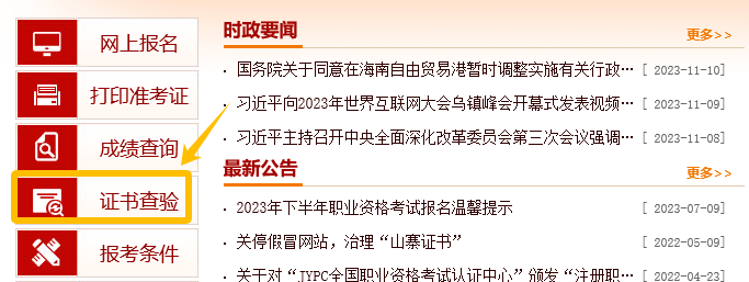 第一步:进入中国人事考试网(http://www.cpta.com.cn),点击左侧【证书查验】栏目。