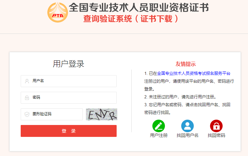 已在中国人事考试网“全国专业技术人员资格考试报名服务平台”注册过的持证人员,请直接使用该平台的用户名、密码进行登录。