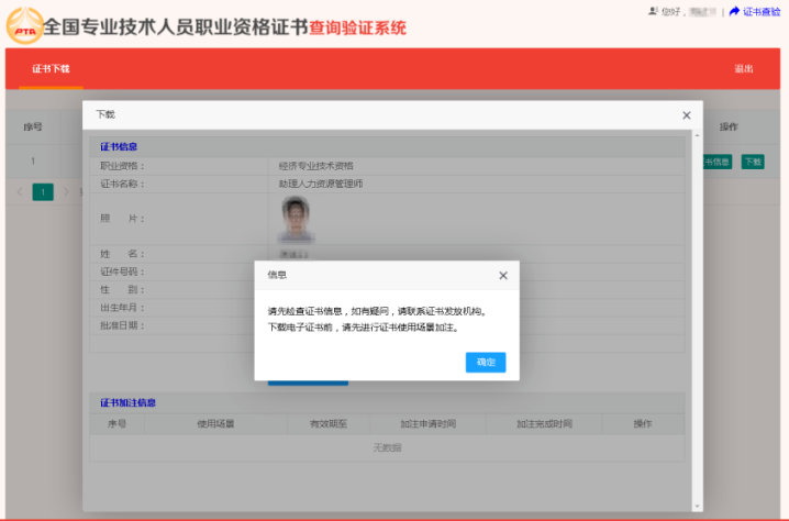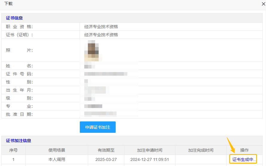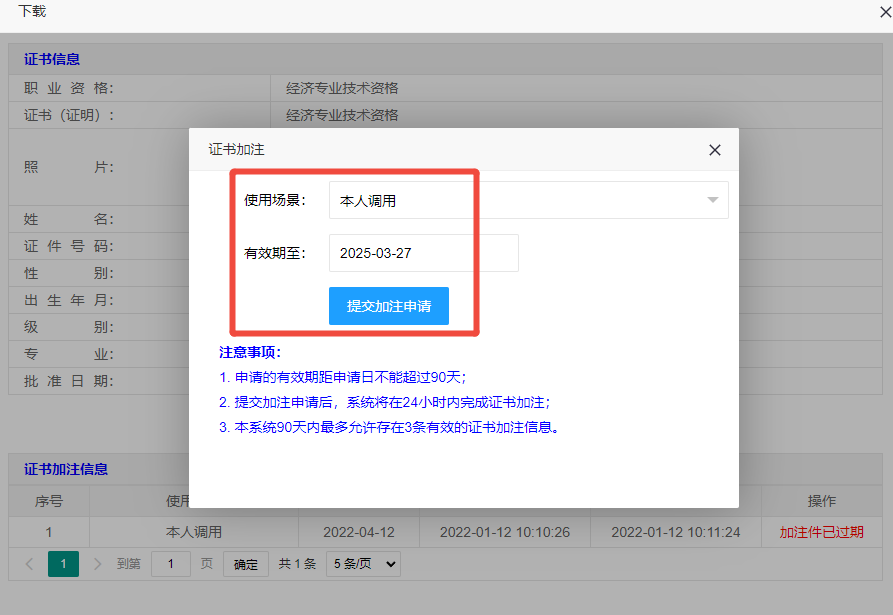点击【下载】按钮,进入电子证书加注、下载页面。证书加注信息内容为空,或者提示“加注件已过期”,须首先完成加注申请。