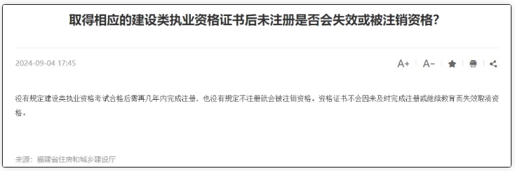 “没有规定建设类执业资格考试合格后需再几年内完成注册,也没有规定不注册就会被注销资格。所以证书不会因未及时完成注册或继续教育而失效取消资格。”