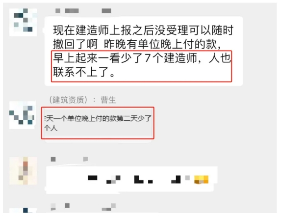 而在这套申请期间,如果一建持证人和企业单位、中J贩子有纠纷、或者说企业注册成功后出现企业或者中J不给持证人补贴、不打款、不履行承诺等行为,这位一建持证人又无法撤销注册申请,只能等着去举报、去注销,最终还只能把持证人的一建强制注销掉。