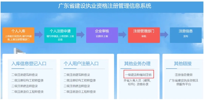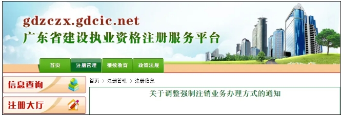 近日,广东省建设执业资格在注册服务平台发布《关于调整强制注销业务办理方式的通知》,根据通知,专业技术人员可以在广东省建设执业资格注册管理系统上申请强制注销证书业务,并且不用提交书面的申请材料,符合要求的系统就会给你在线办理。