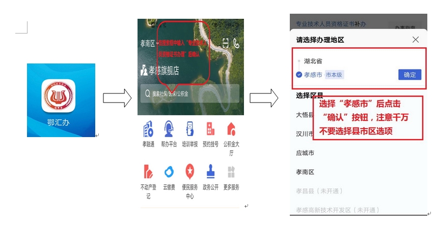 打开手机“鄂汇办”APP,在搜索框中输入“专业技术人员资格证书办理”后确认,选择“孝感市”,注意不要选择县市区选项。