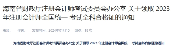 2024年1月10日,海南注册会计师协会发布了《海南省财政厅注册会计师考试委员会办公室关于领取2023年注册会计师全国统一考试全科合格证的通知》,明确了2023年海南注册会计师全科合格证领取时间是2024年1月24日至3月31日(周六、周日及节假日除外)。