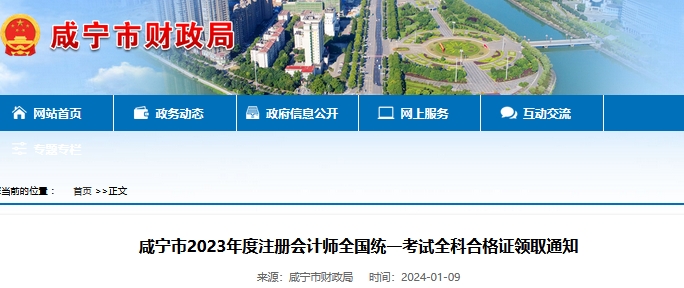 2024年1月9日,咸宁市财政局发布了《咸宁市2023年度注册会计师全国统一考试全科合格证领取通知》,公布了2023年湖北咸宁注册会计师证书领取时间为2024年1月9日至3月31日(不含公休日及法定节假日)。