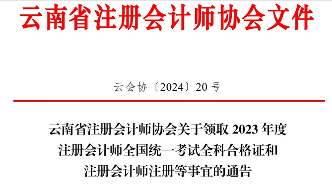 2024年1月23日,云南注册会计师协会发布了《云南省注册会计师协会关于领取2023年度注册会计师全国统一考试全科合格证和注册会计师注册等事宜的通告》,自本通告发布之日起,考生可以到云南省注册会计师协会考试培训科领取证书。