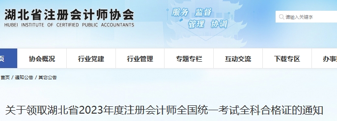 近日,湖北注册会计师协会发布了《关于领取湖北省2023年度注册会计师全国统一考试全科合格证的通知》,其中明确了2023年湖北注册会计师考试证书领取时间是1月8日至2月7日、2月20日至3月31日。